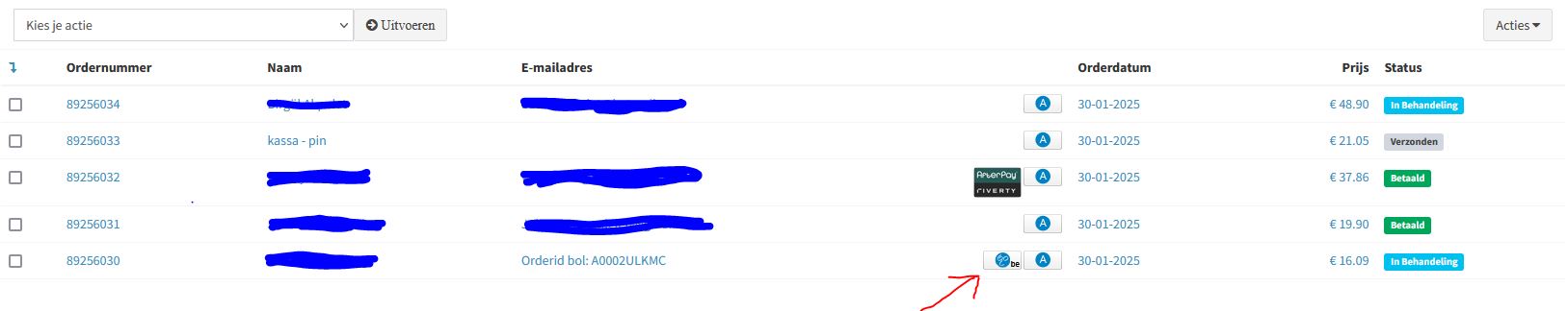 Print op de beheerpagina onder verkooporders dan ook gewoon je pakbonnen uit, en geef ze de juiste status wanneer ze verzonden zijn. Je kan een bol.com order herkennen aan het blauwe bol balletje.